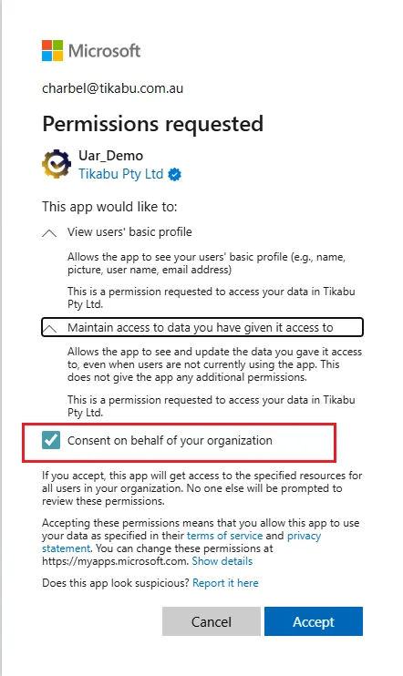 - Ensure that you check the option “Consent on behalf of your organisation” (if prompted).